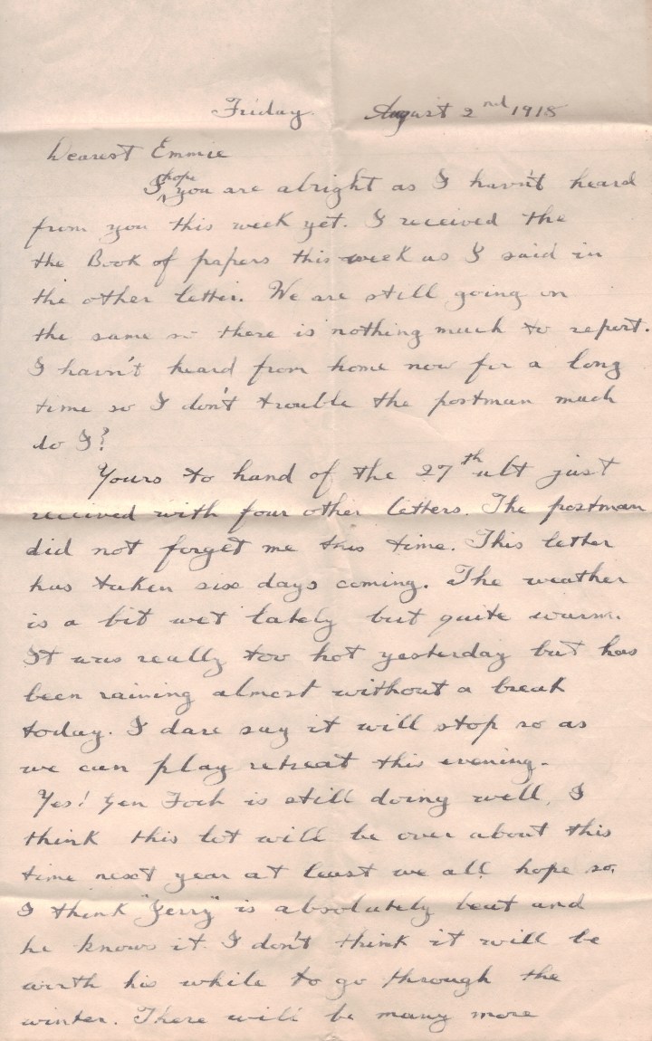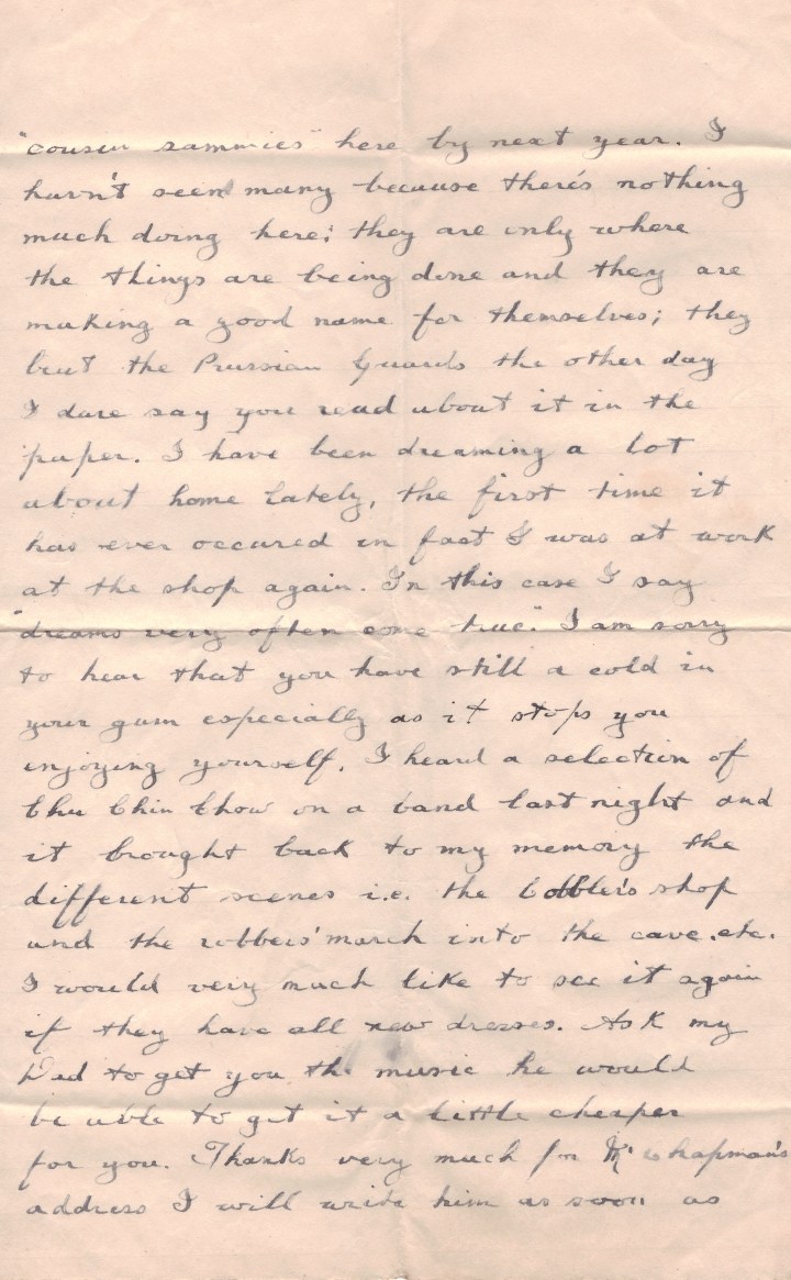 In answer to yours of the 29th ult I don’t think you read that French as I meant you to. It was a joke; I should have told you! Did you see it. It is not exactly against the rules to write in French but the censor might have to find the interpreter which would cause a bit of trouble. I don’t know if I told you I was about 2.5.0 in debt a little while ago but the books have been made up and now I have an enormous credit:- 3/-. I think I’ll take a leave to Blighty to spend it. I am glad to hear George Todd is safe. I wonder how he likes his German home. I’ll write to home when I get his address. I did not see G. Watson what is he in? I can’t make out where he saw me. I think we used to play ‘Maid of the Mountains ‘ in England but I forget how it goes now. Glad to hear the concert party goes on well. I suppose Mr Cannon still sings comic. We are playing retreat soon so I will finish this later. It is now Bank Holiday Monday, I was unable to finish this yesterday. I don’t want to bother about Ch+pn-ism now as I havn’t really time to spend on it. I might speak to our Padre about it. It is only about 500 years old as far as I can make out and if you only listen to one side of the question it will have its desired effect. You say “how is the war getting on” well that’s more of a question I would ask you. We get papers especially printed for us so you see we don’t see both sides of the question. There are Blighty papers issued but I havn’t seen one for some time. The Germans were certainly retreating according to plan when you wrote last; the papers said that his retirement was being very well carried out but now I think he is beginning to run. Of course his plans now are not the original ones of taking Paris etc. but nevertheless they are plans. I do not know the places to which you refer and nobody else here seems to. We have finished our cooker job and I am glad to say they took the first prize in a show. Well I will now close.